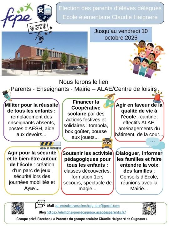 Les élections des parents d’élèves délégués du groupe scolaire Claudie Haigneré sont lancées !